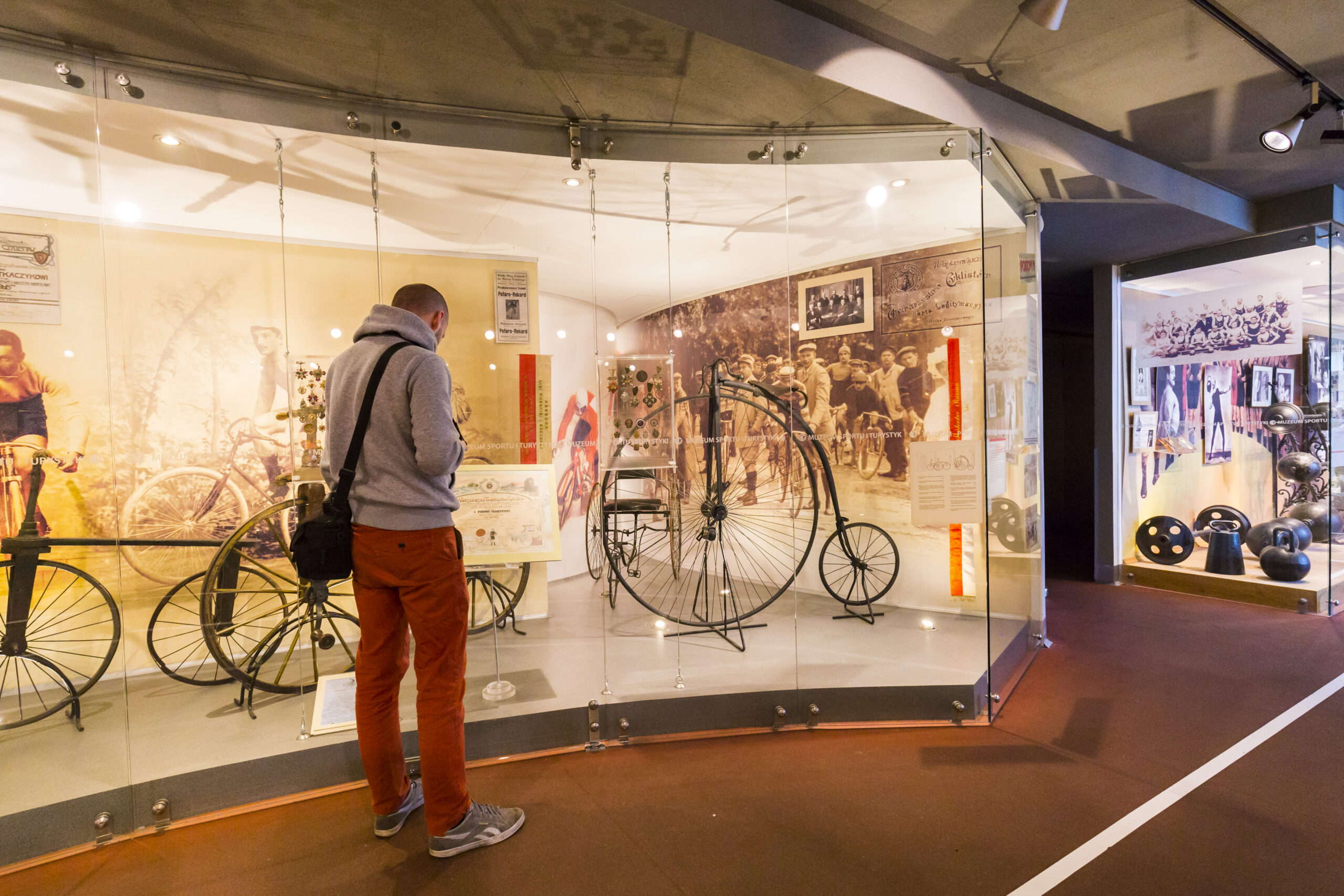 Museum of Sport and Tourism opened in 1952. One od the oldest museums of this sort in Europe. Its collection composes of 45 thousand sport items, also stamps and coins, 56 thousand photographys, 16 thousand books and over 2 thousand documents and records. Museum collection is completed with film and sound documentation. Building of olimpis Center is a 7- storys building (one underground). Building is soaked with olimpic spirit, formally expressed in shapes and functions. Shape of the building is efficient. It is built on an elipse and its lift resembles olimpic flame, while its roof was inspired by stadium architecture. The front is ornamented with olimpic circles. The ground floor has a black ceiling, grey concrete walls and grey dolomite floors.