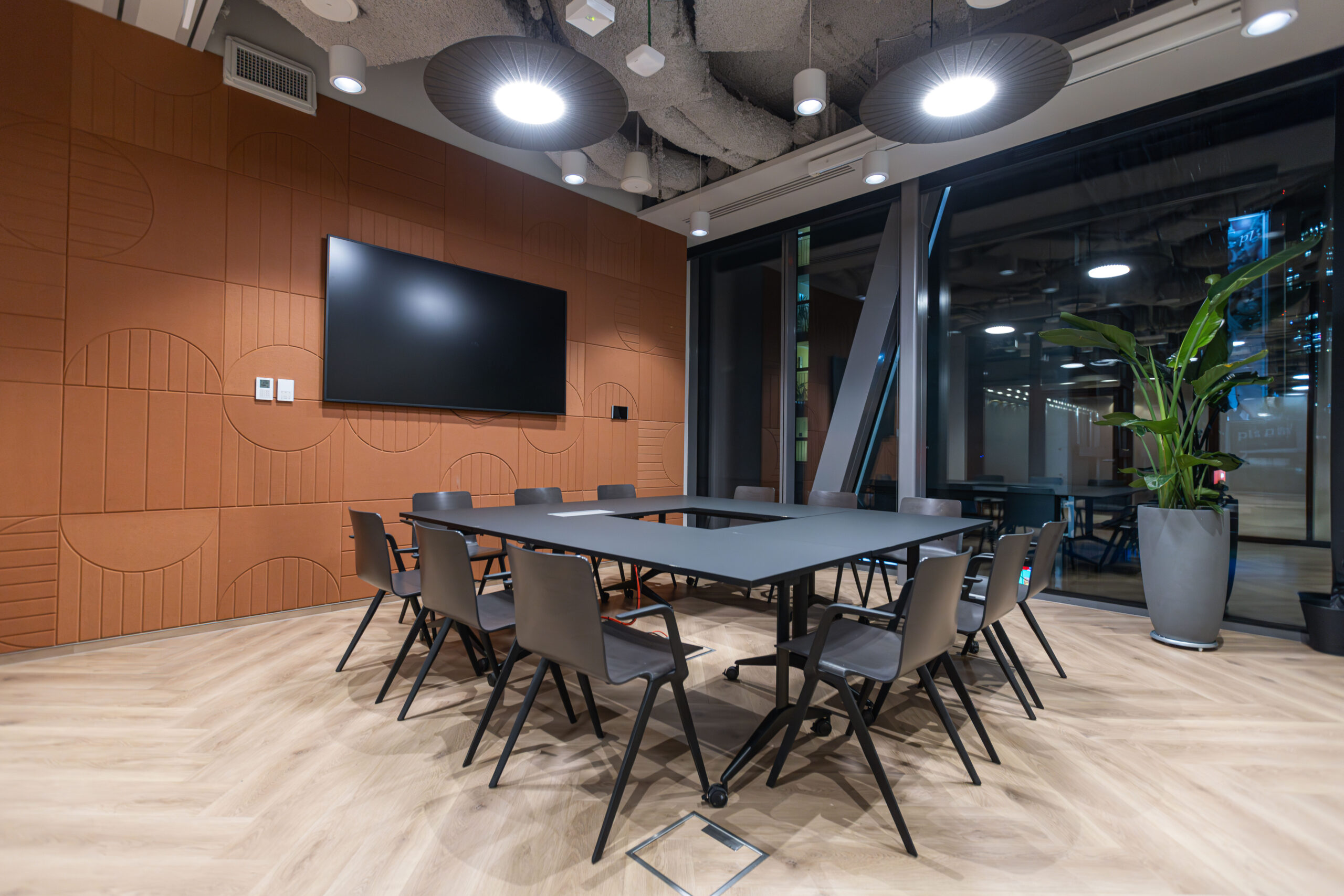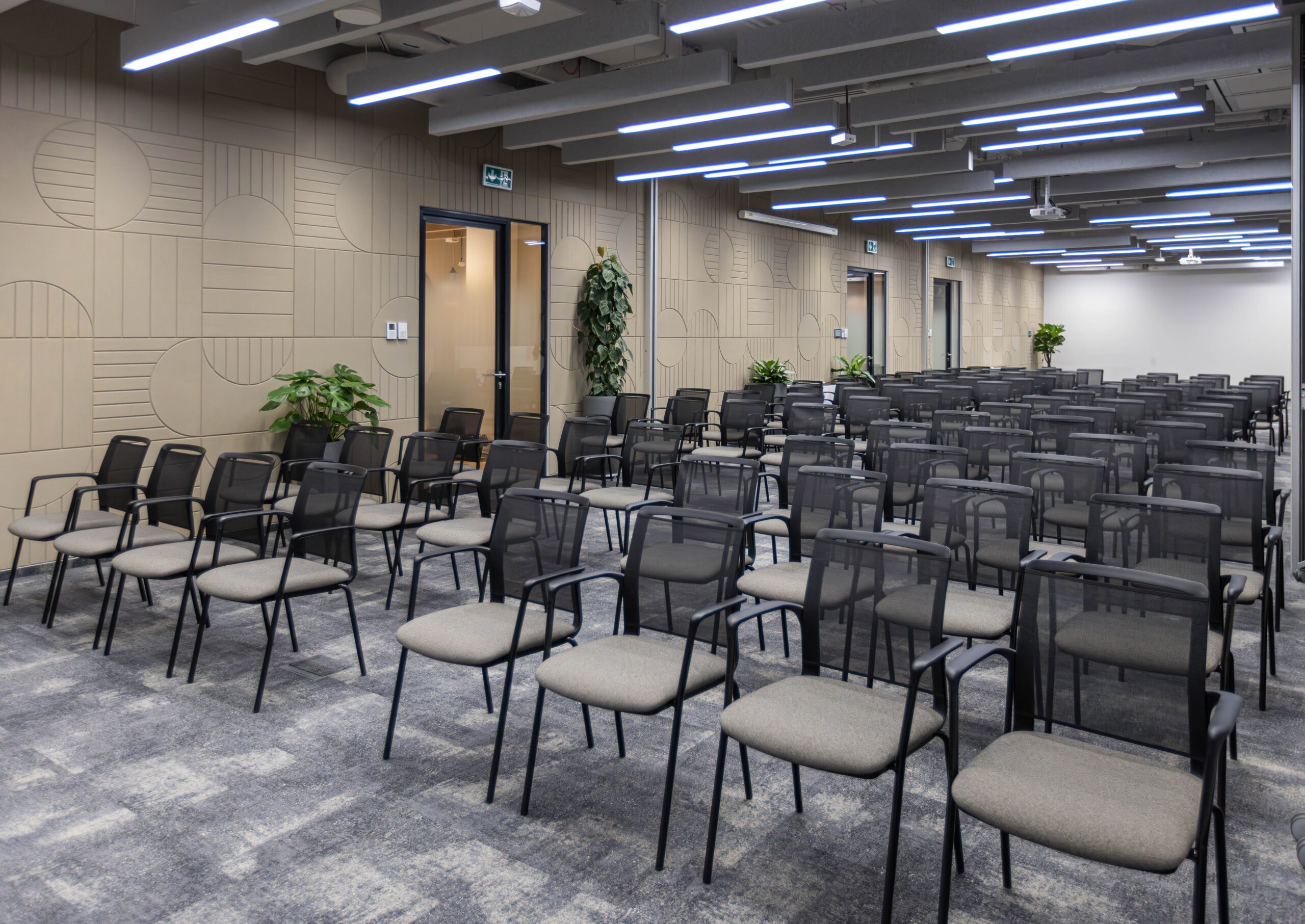 Centrum oferuje 650 m² nowoczesnej i elastycznej przestrzeni, którą można swobodnie dostosować do różnych formatów spotkań. Układ wnętrza obejmuje 9 sal konferencyjnych o zróżnicowanej wielkości oraz otwartą przestrzeń eventową AORA.