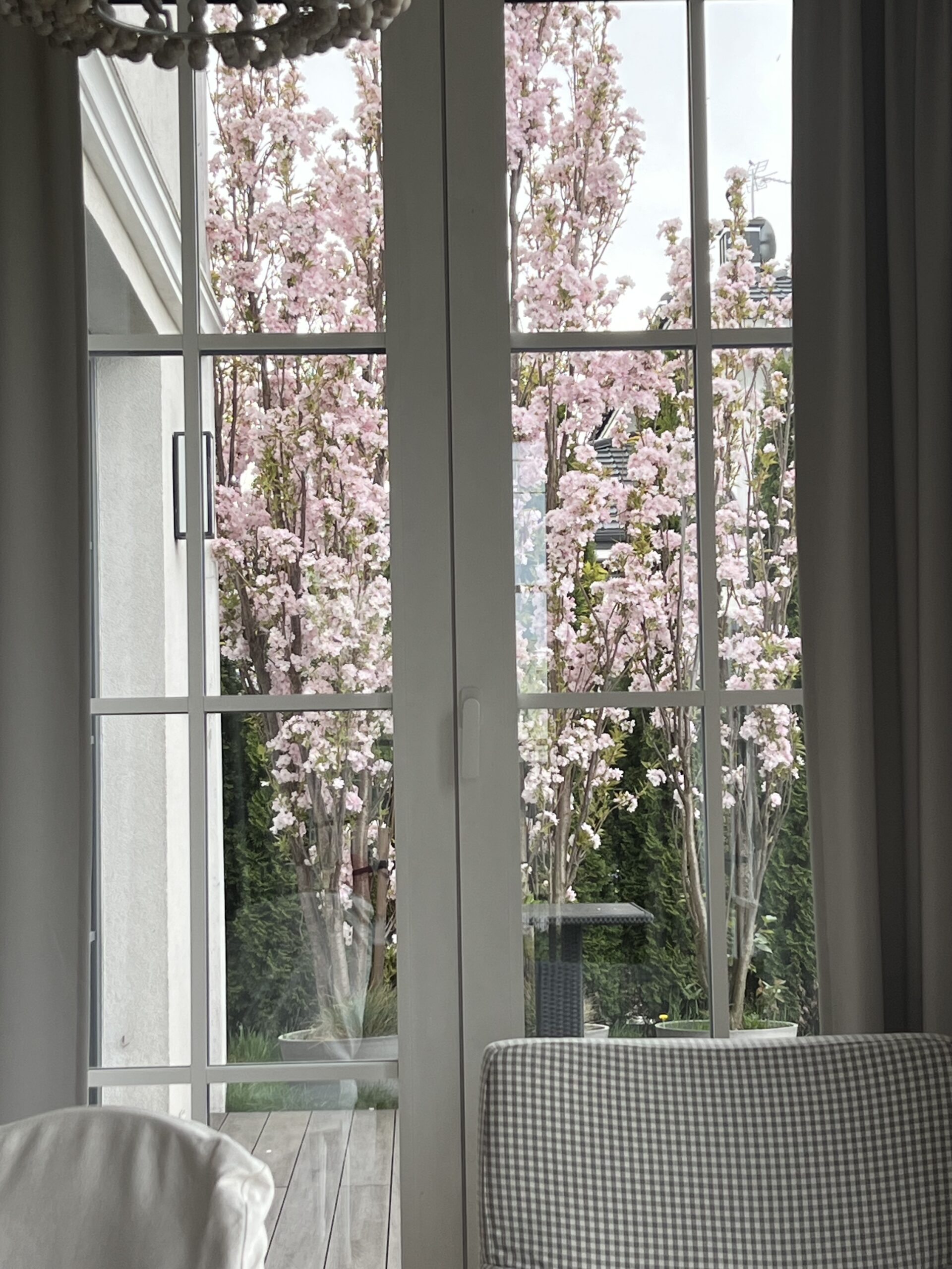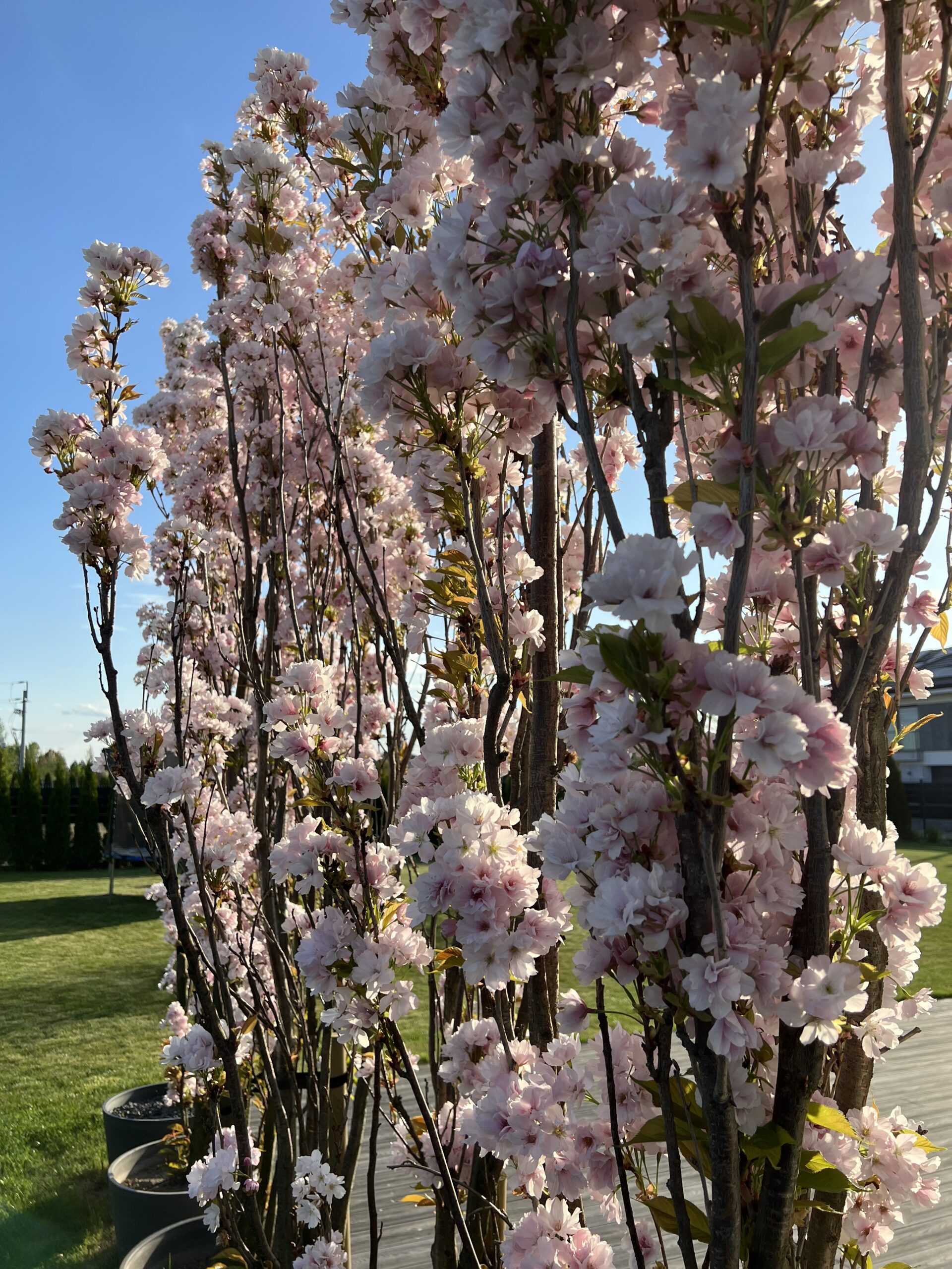 Do domu przylega piękny ogród z pięknie kwitnącymi wiśniami, różami i hortensjami, z gruszą na środku ogrodu.