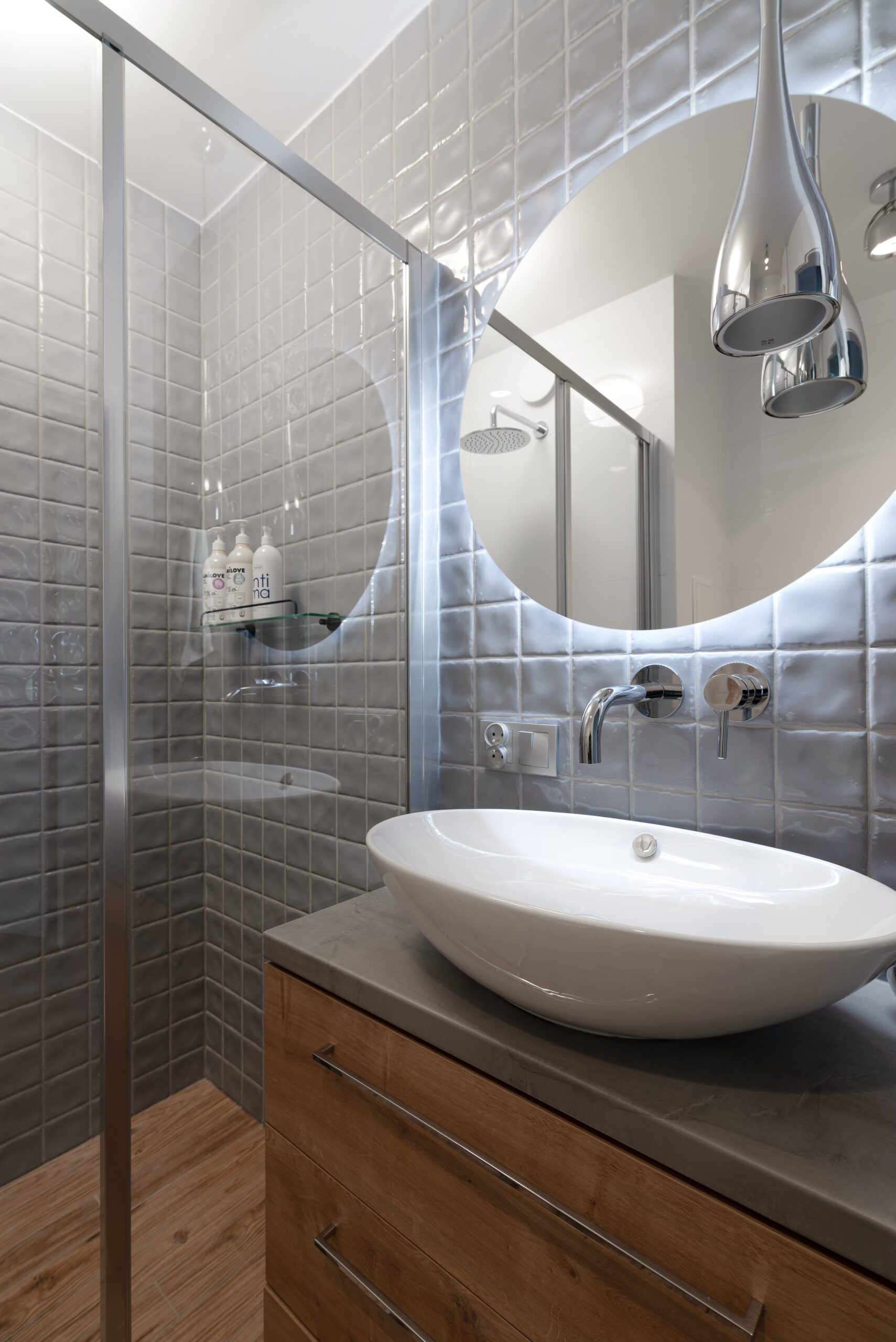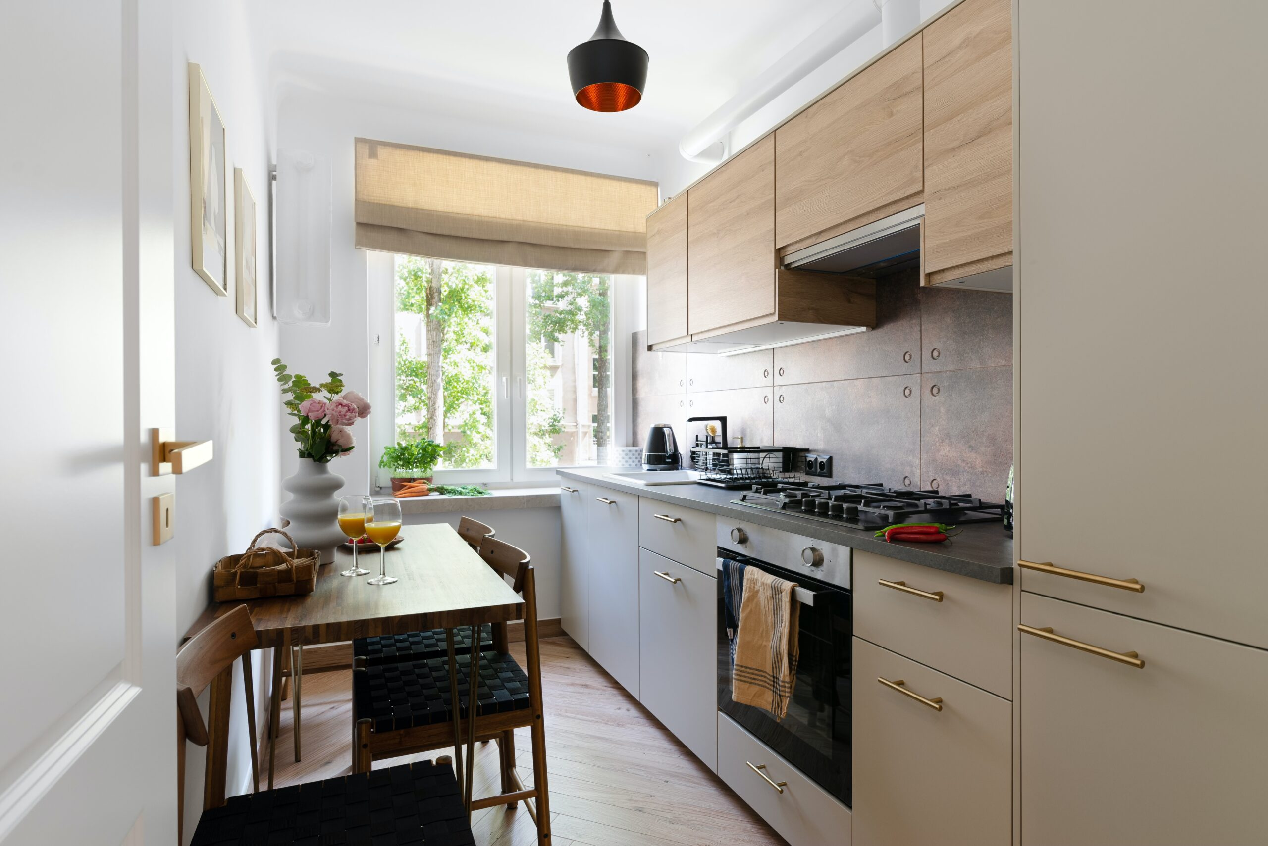 Wnętrze utrzymane jest w nowoczesnym stylu z neutralną kolorystyką i dużą ilością naturalnego światła.