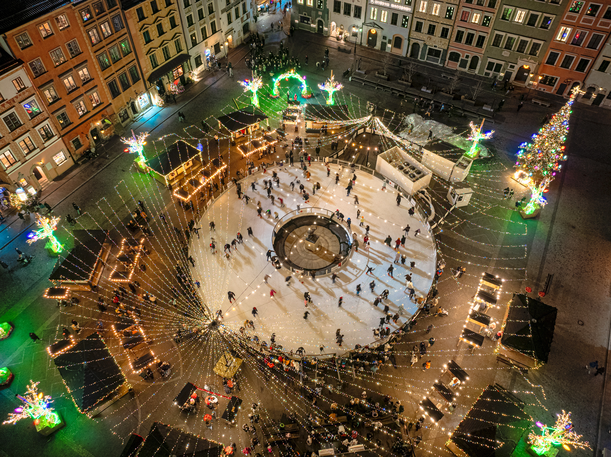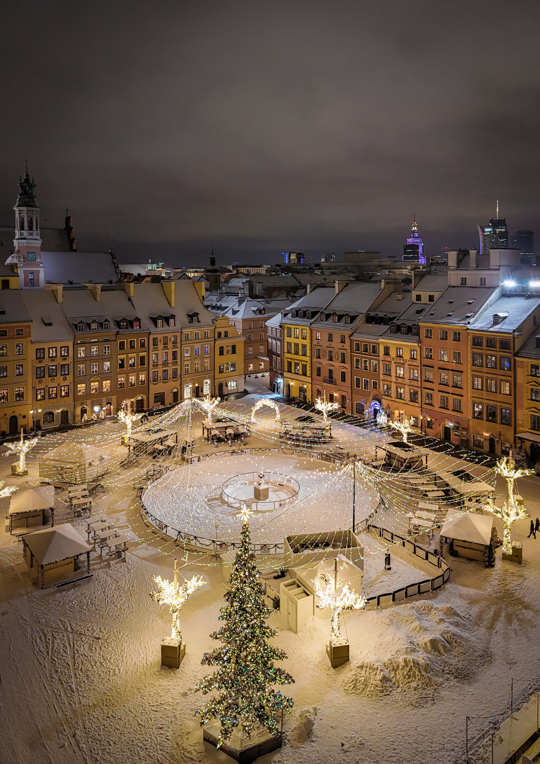 dekorowany jest świątecznymi ozdobami oraz choinką. Na rynku znajduje się pomnik Syrenki. Pierzeje Rynku Starego Miasta są szczelnie wypełnione kamienicami